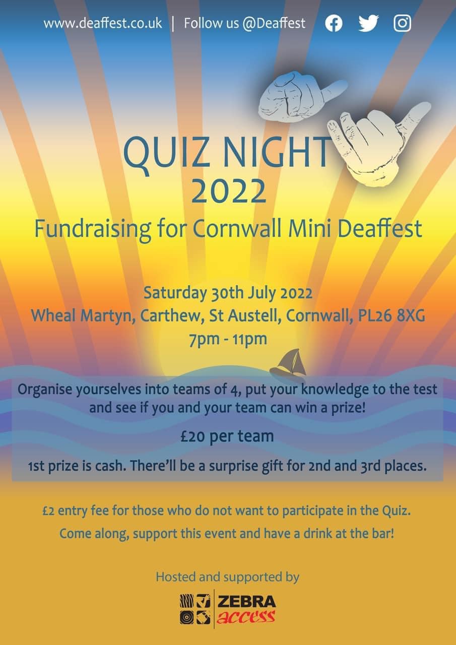 Can you support us in fundraising for the next mini Deaffest in Cornwall? Join us for the Quiz Night this July!