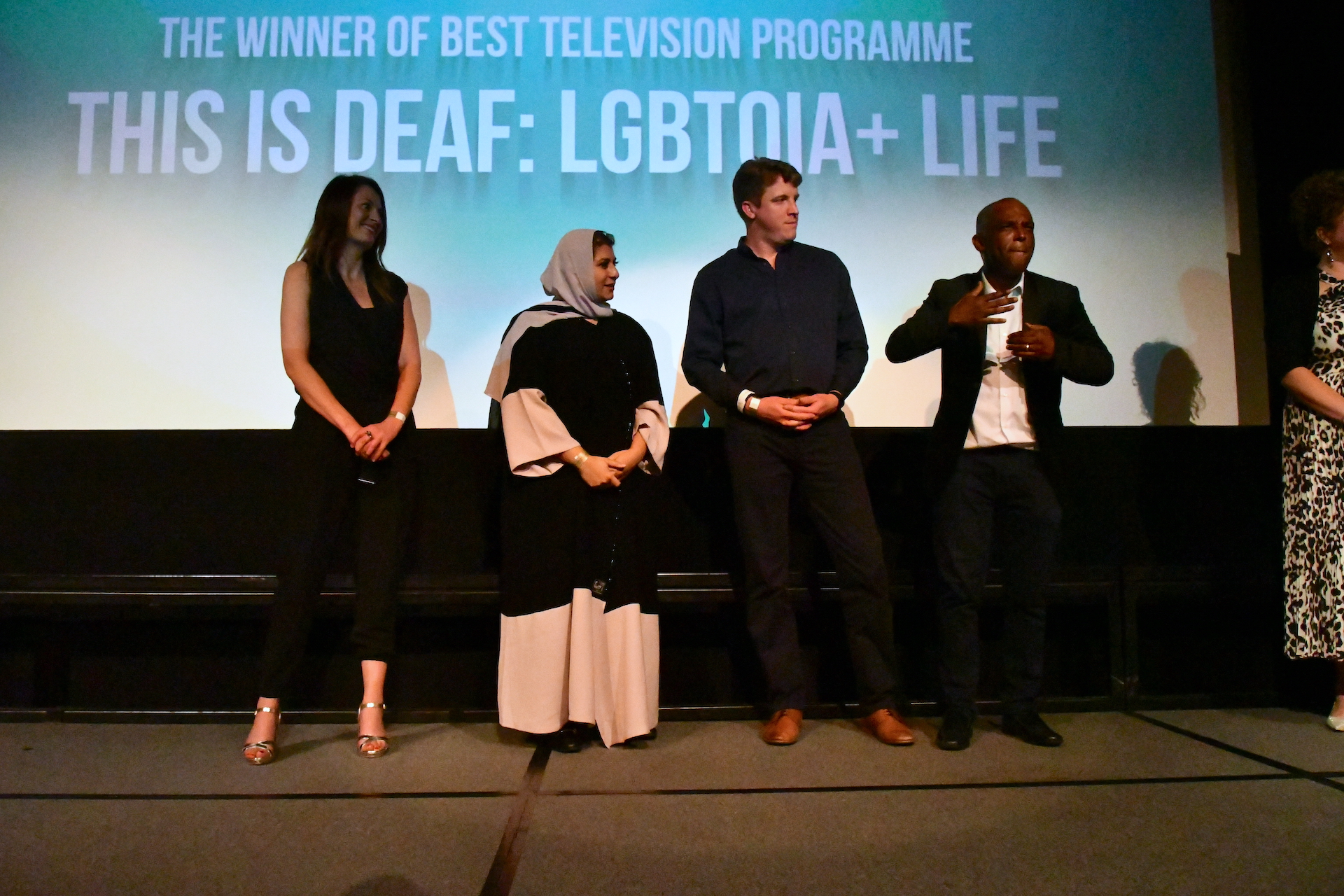 The highly anticipated 8th Film & TV Awards Gala took place in the evening, led by two fantastic MCs Julian Peedle-Calloo and Yvonne Cobb – BBC’s See Hear presenters. The atmosphere was buzzing, with laughter and smiles in every direction. High profile award presenters including our main sponsors from SignVideo, BSL Zone and Zebra Uno presented awards to 11 category winners.