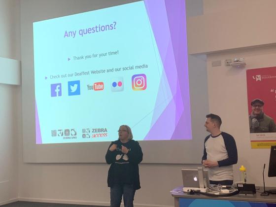 Jenny Köhring with one of Deaffest’s Media Team, Matthew Shaw, presenting at the University of Wolverhampton. Photo taken by Zebra Access